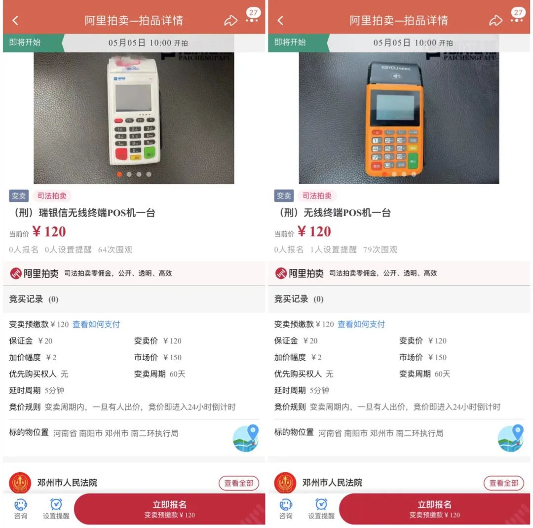 此外,小編還發現其中有部分拍品是剛上架,比如下圖的拉卡拉、卡友支付的2臺終端,起拍價為120元,有多人次圍觀。小編發現該拍品此前拍賣價格是150元,流拍后又降低了30元繼續拍賣的,感覺還得第三次,不然120元買來干嘛?