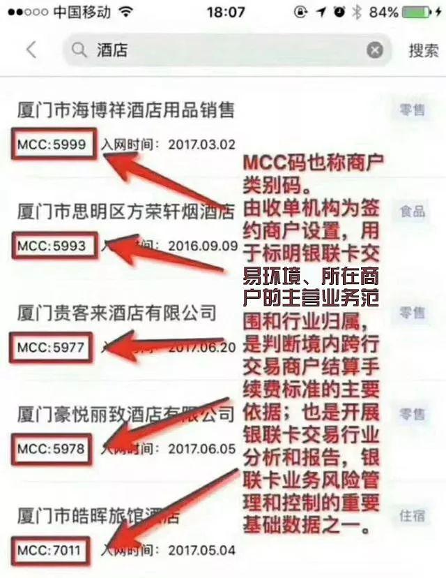 商戶類型碼(通稱MCC,MCC碼)四位大數字編碼構成。由三方支付平臺為簽訂商戶設定,用以標出銀聯信用卡交易自然環境、所屬商戶的主營范疇和制造行業所屬,是分辨地區轉賬交易商戶清算服務費規范的關鍵根據;都是進行銀聯信用卡交易行業現狀和匯報,銀聯信用卡業務流程風險管控和操縱的關鍵數據資料之一。