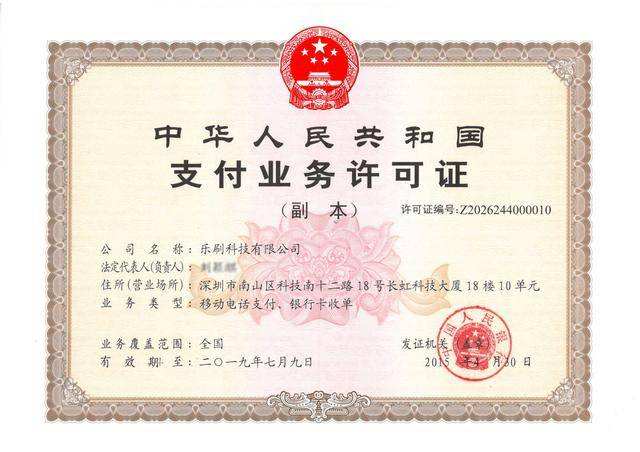 樂刷于2014年獲得央行頒發的《支付業務許可證》。樂刷卡樂寶是屬于個人POS機類型的電簽POS機,經過銀聯認證,正規一清機,資金安全有保障。